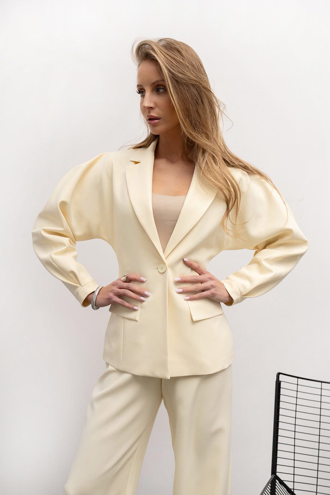 Elegancka marynarka w maślanym odcieniu to jeden z najmocniejszych trendów tej wiosny. Jej perfekcyjnie skrojony, taliowany fason pięknie modeluje sylwetkę, a delikatnie bufiaste ramiona nadają całości modowego charakteru i lekko podkreślają linię ramion.