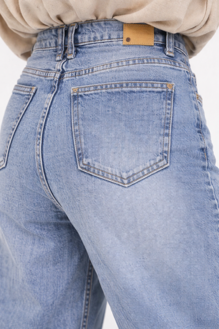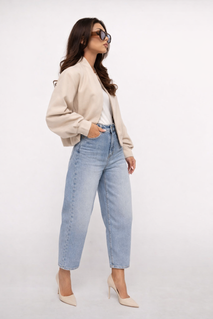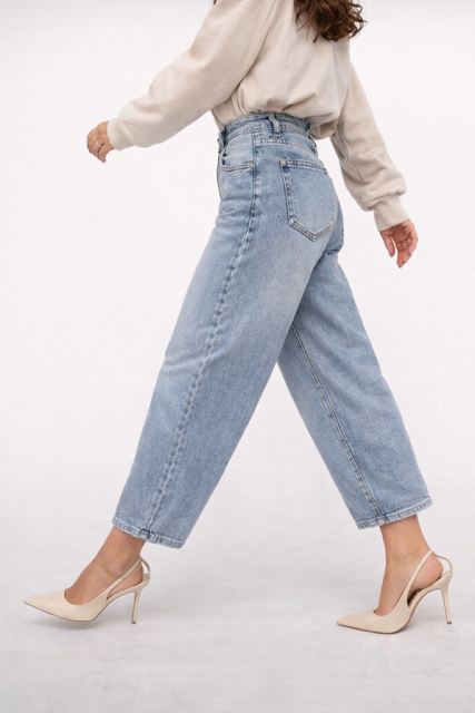 Model, który pięknie buduje proporcje sylwetki. Jeansy o kroju balonowym z wysokim stanem podkreślają talię, a jednocześnie nadają stylizacji modowego, nowoczesnego charakteru. Nogawka lekko zwężana ku dołowi sprawia, że sylwetka wygląda lekko i proporcjonalnie.