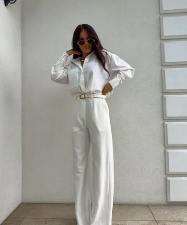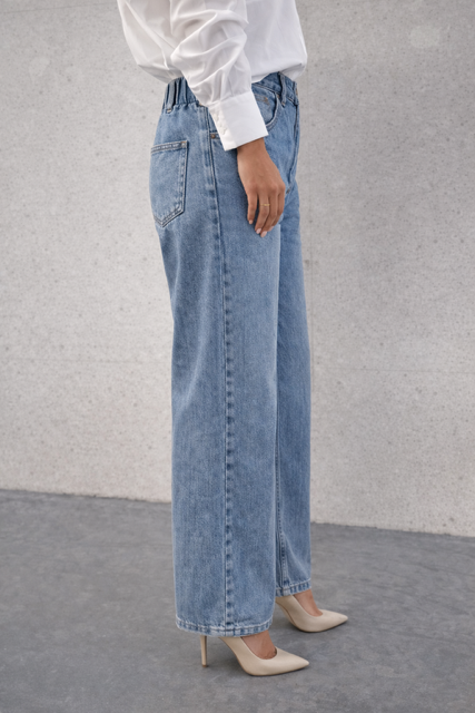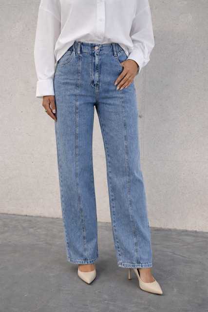 Jeansy z szeroką nogawką, które łączą styl i komfort. Elastyczny materiał sprawia, że noszą się jak legginsy, a przeszycie wzdłuż środka nogawki dodaje im nowoczesnego charakteru. Talia z gumką z tyłu idealnie dopasowuje się do sylwetki, zapewniając wygodę przez cały dzień. Doskonałe do casualowych i eleganckich stylizacji – świetnie wyglądają zarówno z koszulami, jak i oversize’owymi swetrami.