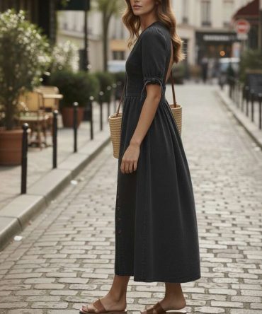 Delikatna bufka na ramionach subtelnie podkreśla sylwetkę i dodaje charakteru, a konstrukcja modelu pięknie układa się na ciele – bez efektu ciężkości, który często pojawia się przy jeansie. Materiał jest elastyczny, dzięki czemu sukienka pracuje razem z Tobą i daje komfort przez cały dzień.