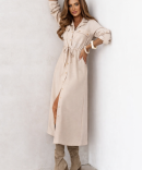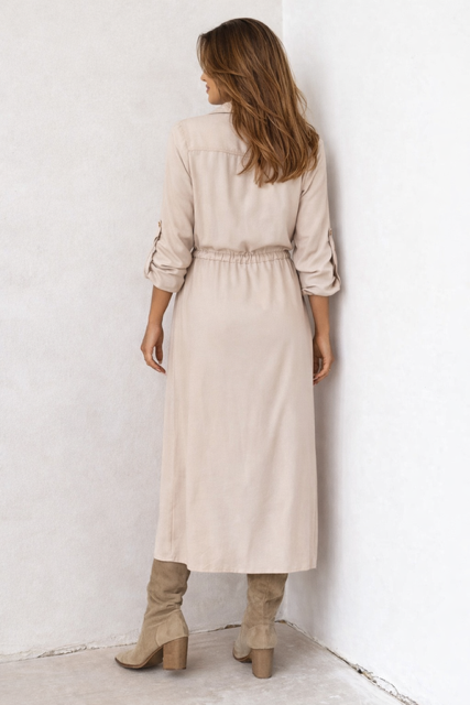 Sukienka szmizjerka w beżowym kolorze – kobiecy i niezwykle uniwersalny model, który dopasujesz dokładnie do swojej sylwetki. Dzięki wiązaniu pod biustem możesz samodzielnie regulować obwód – podkreślić talię lub nosić sukienkę w luźniejszej, bardziej swobodnej formie.