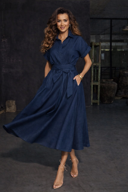 Model posiada pasek, który możesz związać w talii, aby ją podkreślić i nadać sylwetce kobiecych proporcji, lub puścić luźno i przewiązać z tyłu – wtedy sukienka zyskuje bardziej swobodny, minimalistyczny charakter, a detale stają się jeszcze bardziej widoczne.